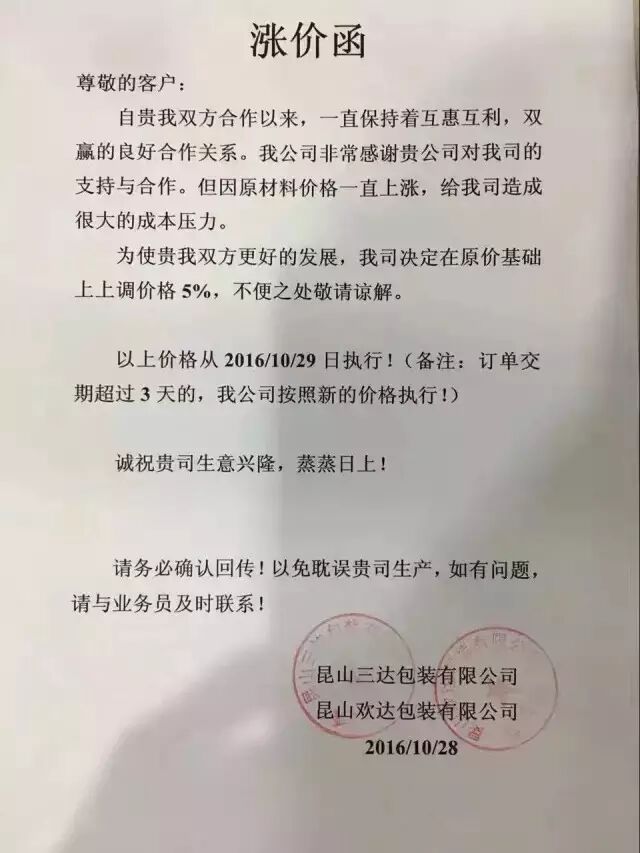 恭喜之前已發貨的客戶,您的貨現在已經升值了!看這個趨勢,原料還會繼續上漲,漲價潮真的開始了:親愛的客戶,別說你不知道 !